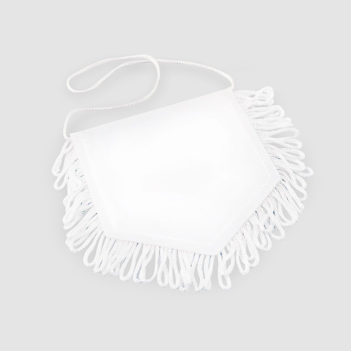 Bedruckbarer, weißer Autowimpel aus Polyester-Satin mit weißen Fransen und Aufhängeband. Der Wimpel ist bestens geeignet für die Bedruckung.