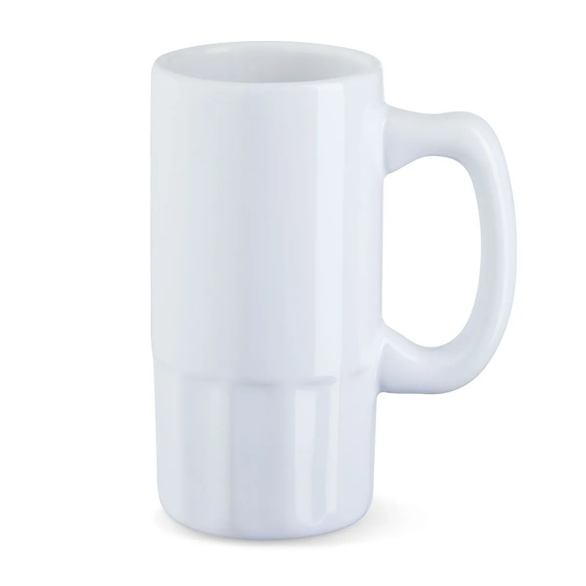 Hochweiß-glänzender Bierkrug aus Keramik mit geriffeltem Boden. Aufgrund der hochwertigen Orca-Beschichtung bestens zur Sublimation geeignet und spülmaschinenfest.