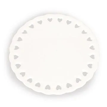 Weißer, bedruckbarer Untersetzer oder Anhänger aus Keramik mit Herzmotiv am Rand. Bestens für die Bedruckung geeignet.